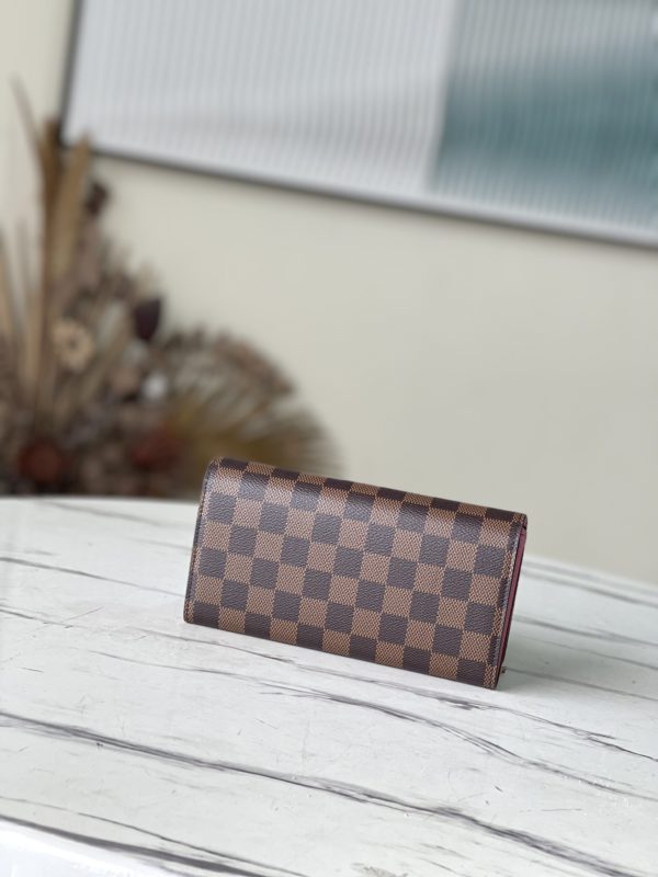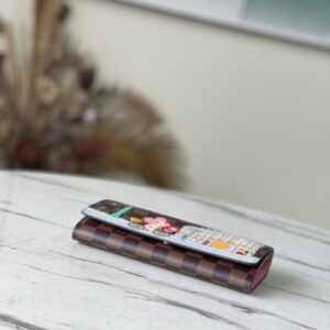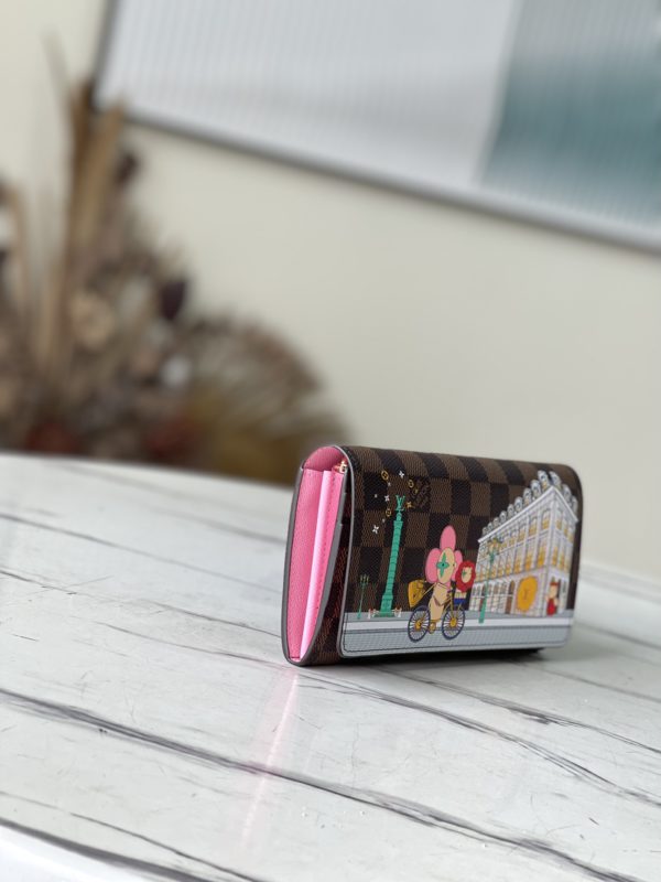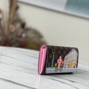 This Sarah wallet is made of Damier Ebene canvas and reinterpreted in the Vivienne Holidays 2022 series, highlighting the spirit of travel. The limited-edition print on the wallet pays homage to Paris with a colorful scene as Vivienne, the Louis Vuitton mascot, cycles past the store in Place Vendome. This elegant collector’s edition flap wallet is lined in pink leather, making it the perfect gift.