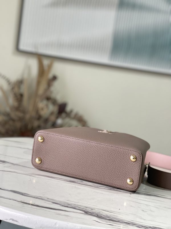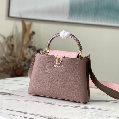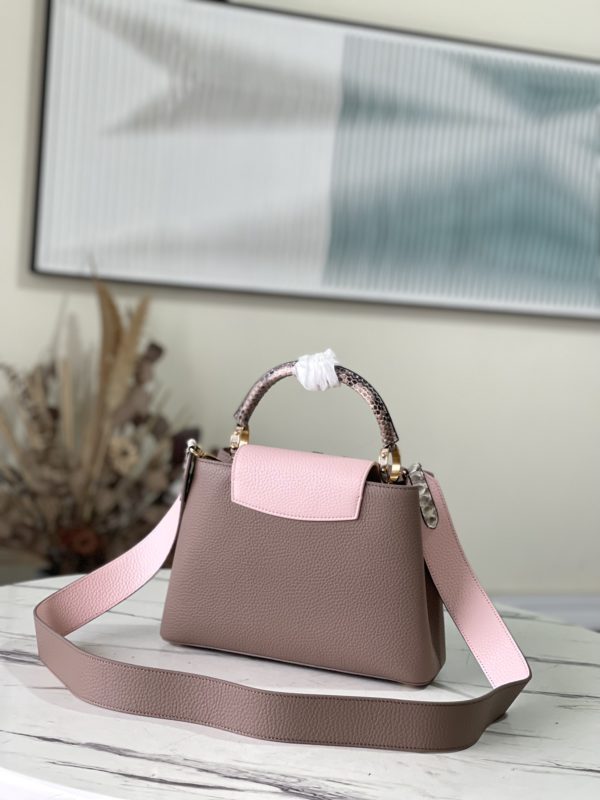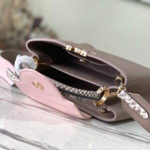 Small CAPUCINES handbags with color matching and python gold buckle Spring Capucines BB handbags are dipped in soft tones, and the handle and logo release the exotic charm of python skin. The wide, detachable shoulder strap and top handle allow for versatile carrying options, day or night.