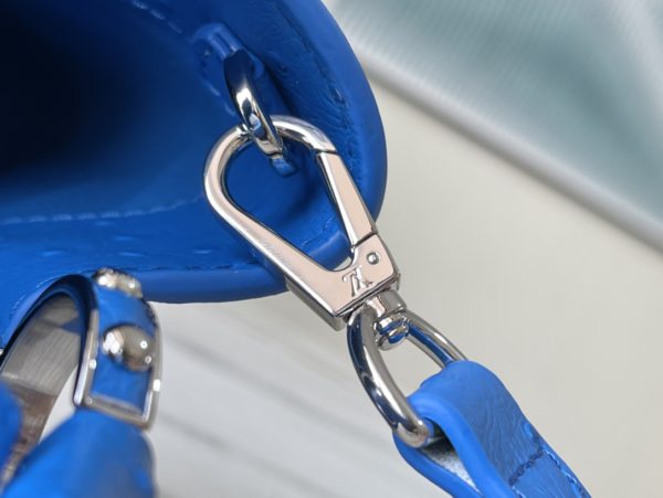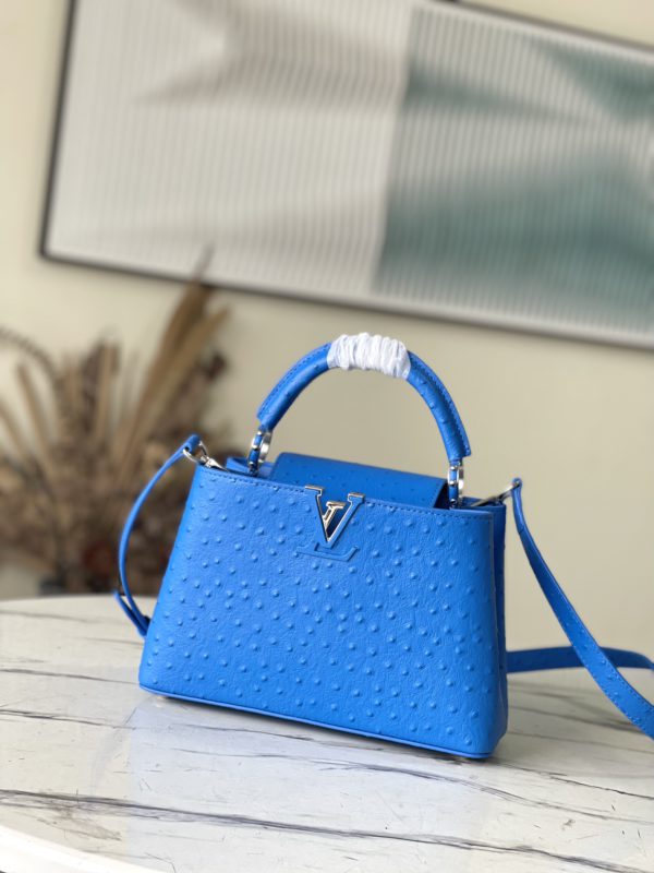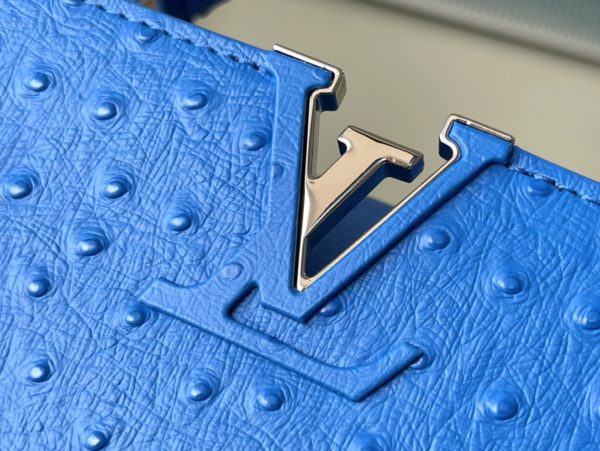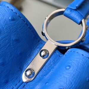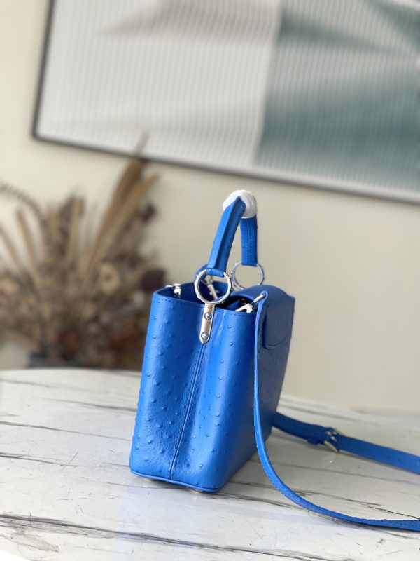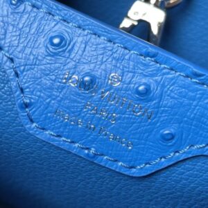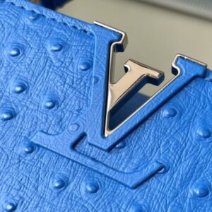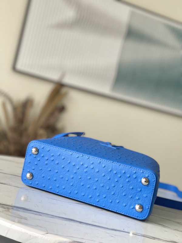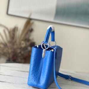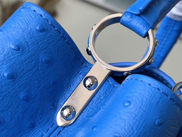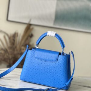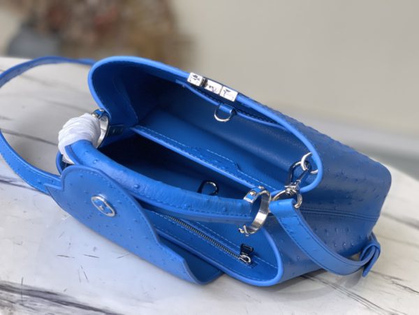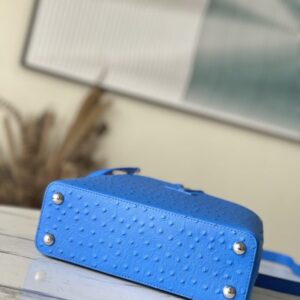 Blue ostrich leather small Capucines ostrich leather handbag, moderate hardness handle, gorgeous buckle connecting the handle, and spacious and practical shape, etc. The drop cover can be used in two ways, and it can be placed outside the bag to show the fashion trend of the Monogram flower pattern.