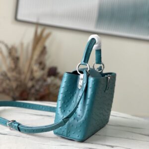 Small Capucines ostrich leather handbag in blue ostrich leather, moderate hardness handle, gorgeous buckle connecting the handle, spacious and practical shape, etc. The drop cover can be used in two ways, and it can be placed outside the bag to show the fashion trend of the Monogram flower pattern.