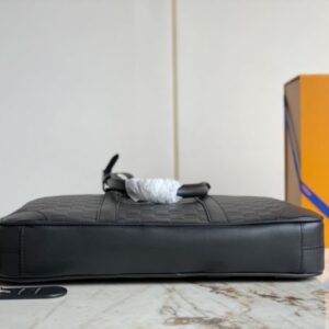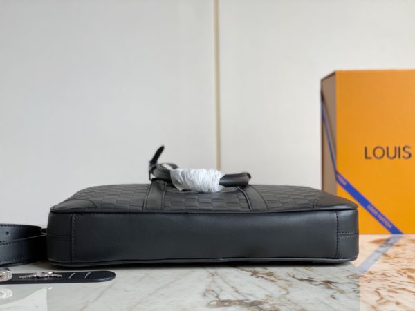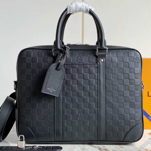 Black Full Leather Pressed Men’s Briefcase Series This small Voyage briefcase is made of Damier Graphite coated canvas, with leather side straps, reinforced corners, top handles and nameplates. An exterior pocket is convenient for smartphone storage, a padded interior compartment can hold a 13-inch laptop, and the detachable and adjustable shoulder strap provides comfortable shoulder carry.