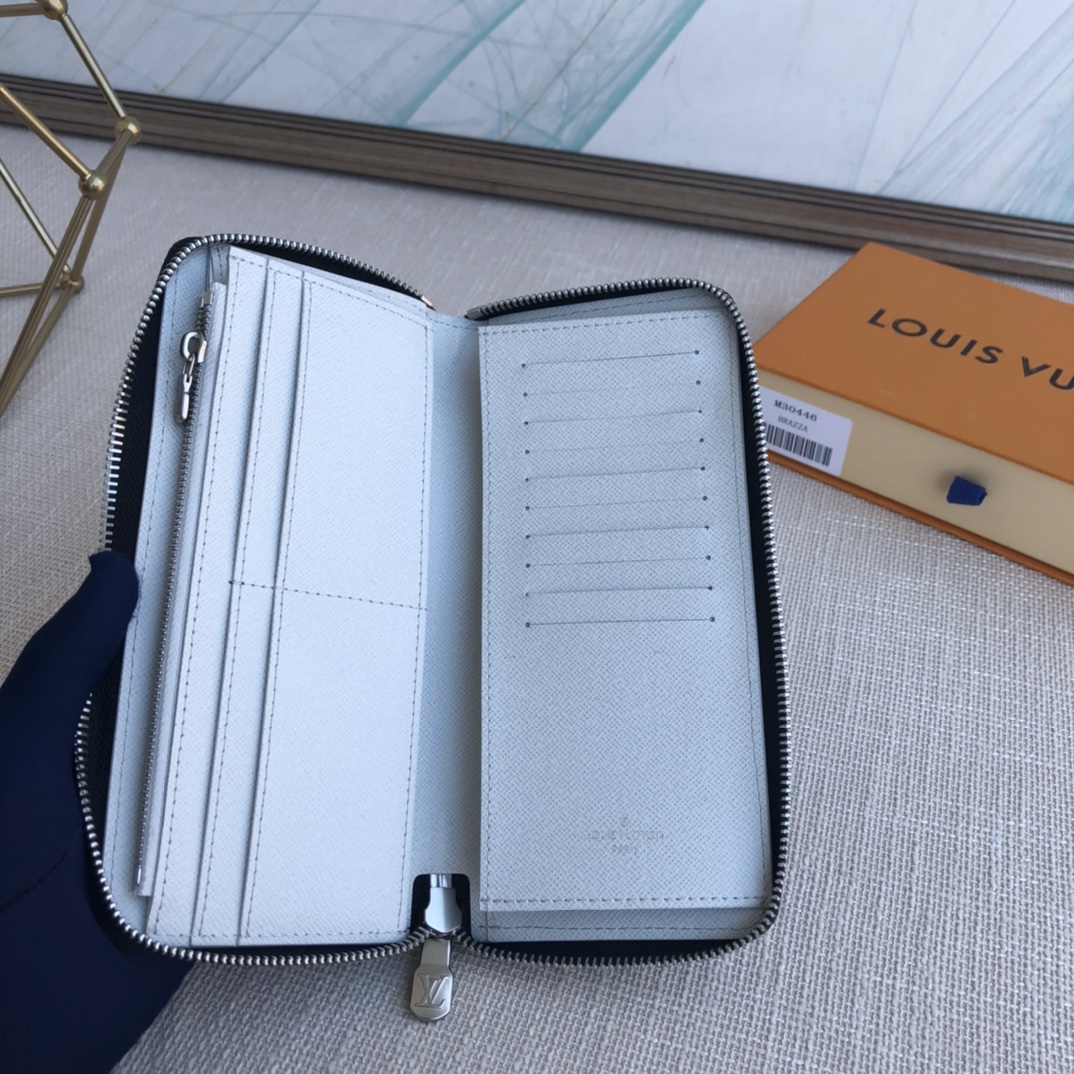 Exclusive real shot! The Taïgarama Zippy Vertical Wallet combines Taïga leather and Monogram Eclipse canvas with a wraparound zipper structure to securely protect the organized interior, featuring an accordion compartment for bills, zipped coin pocket and card slots.