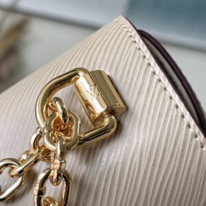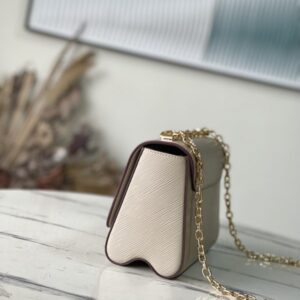 Elephant gray Twist handbags debuted at the 2015 Cruise early spring show and became a new classic of the brand. The Twist Medium Chain Bag is crafted from iconic Epi leather with an LV Twist lock in shiny metal. The wavy bottom cleverly builds ample space, and the sliding chain shoulder strap can be folded over the shoulder or unfolded across the body, making it easy to shine on day and night occasions.
