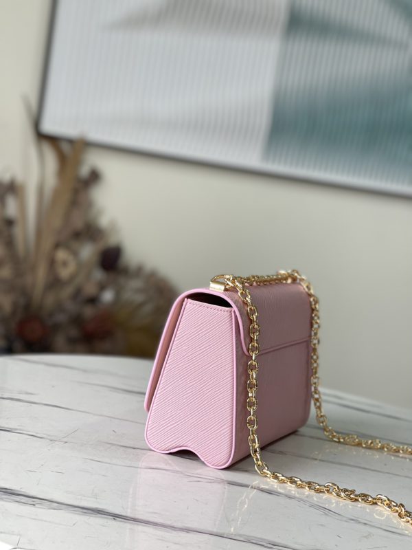This Twist medium handbag is made of iconic Epi grain leather, and declares summer fashion in eye-catching new colors. Leather lining creates color contrast, and the sliding chain shoulder strap has leather shoulder pads for comfortable shoulder and cross-body wear.