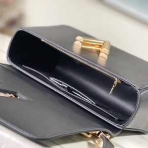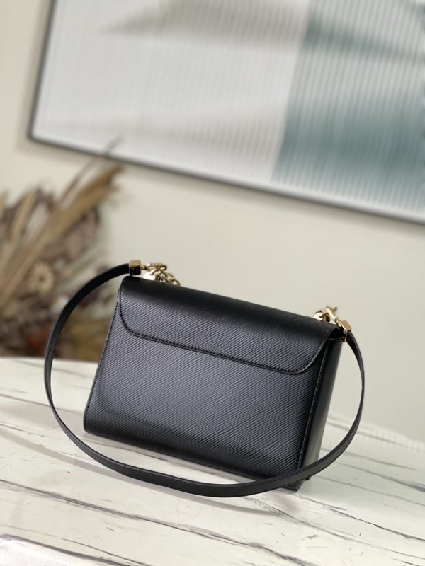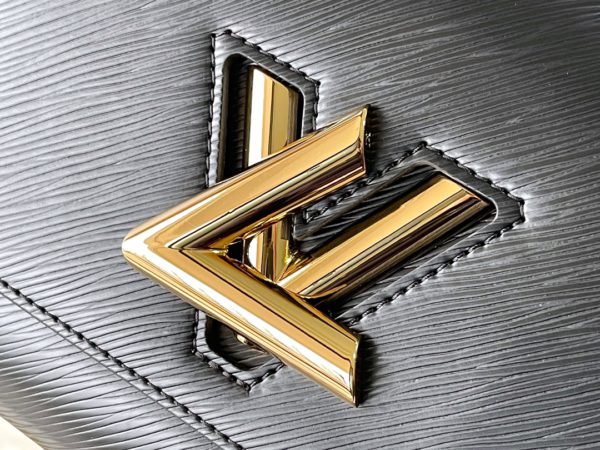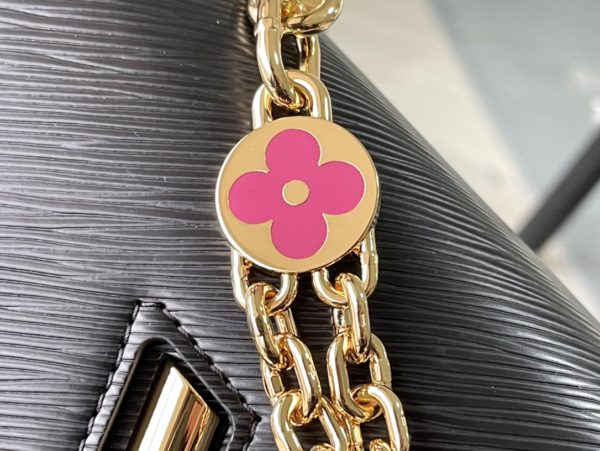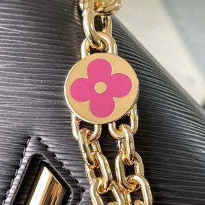 This Twist medium handbag incorporates an enamel Monogram flower into a double chain, which can be used as a delicate embellishment or connected to the shoulder strap for more styling possibilities. Epi grained leather body with smooth leather trim and lining.