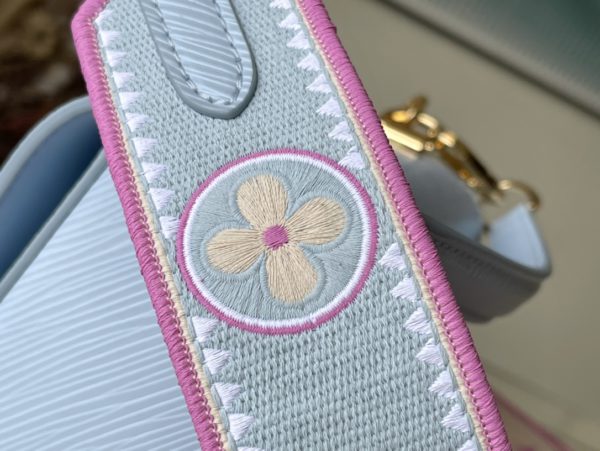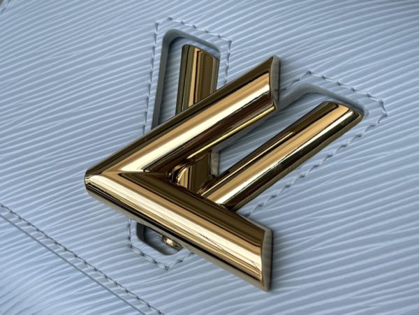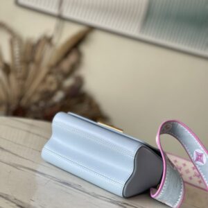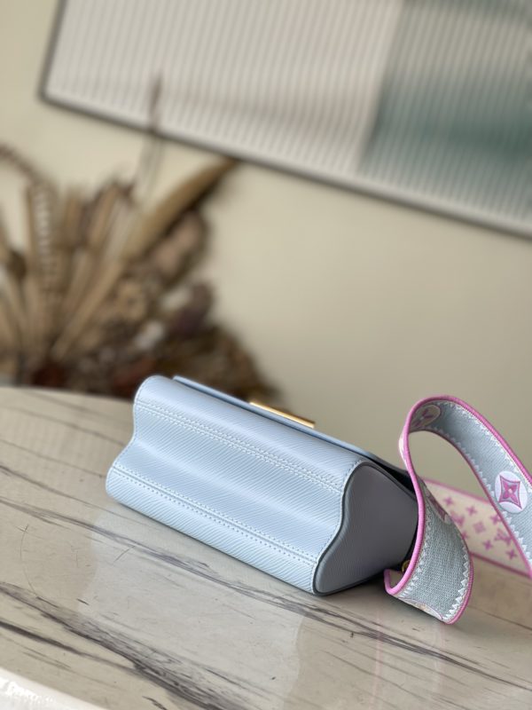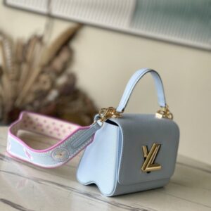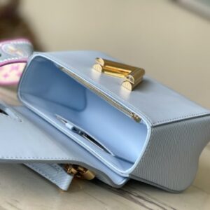 This Twist small handbag is made of Epi grain leather. The two sides of the detachable wide fabric shoulder strap depict an enlarged version of the Monogram flower and a pocket size of the Monogram pattern. presentable.