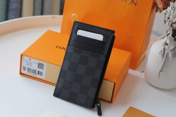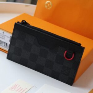 Unlock the scattered small object storage technique in a trendy way. Damier Graphite canvas with leather trim and sporty metal D-rings, card slots, zip pocket and compartment that stores bills flat.