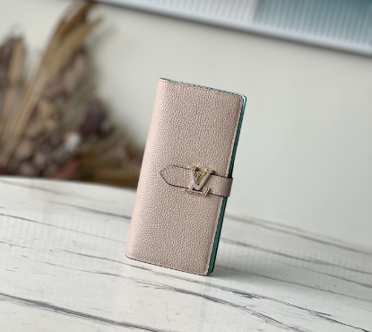 This LV Vertical wallet is made of soft grained Taurillon leather, with lettering for the sliding closure, inspired by the design of Capucines handbags. The pop-up contrast lining features a card slot, zipped coin pocket, and large V-shaped compartment for bills and receipts.