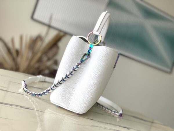 Capucines BB handbag gives colorful colors to the LV letters and woven chain, which contrasts with the simple and elegant style of the Taurillon leather bag. The jewelry-like handle rings and rivets continue the lustrous color, while the metal hardware adds bright details.