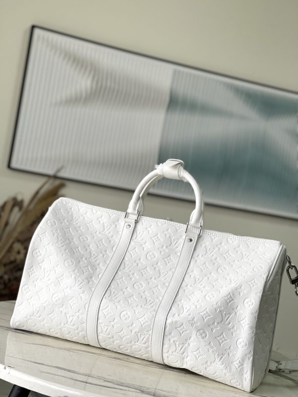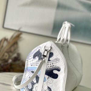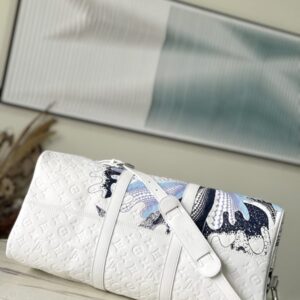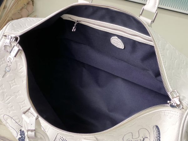 YK Keepall 50 travel bag from x Yayoi Kusama cooperation series. Thousands of polka dots intertwine to form a psychedelic flower outline, symbolizing the transience of life and the infinity of time, representing the well-known creative imagery of this Japanese artist. The x YK logo points out the identity of the series, making it another good collection.