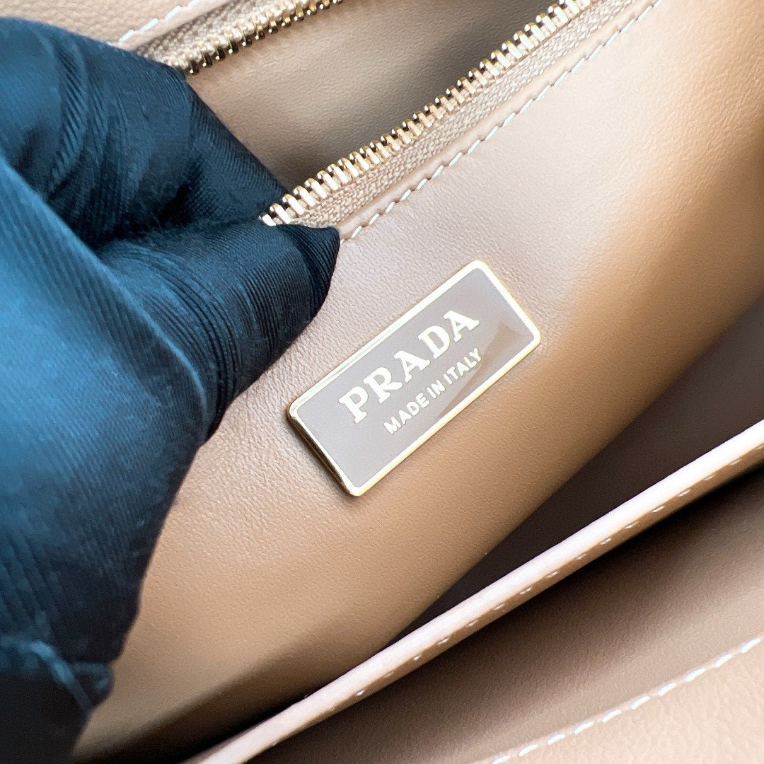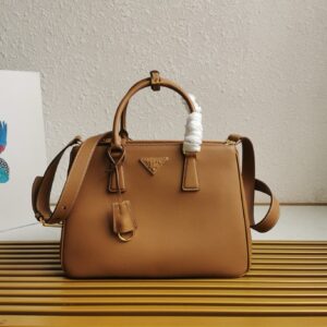 The sophisticated and timeless Prada Galleria bag combines industrial precision and refined, meticulous workmanship that is inherent in the brand’s DNA. Composed of over 80 separate pieces assembled by hand, the style celebrates the historic store opened in 1913 in Galleria Vittorio Emanuele II of Milan. The leather accessory, characterized by the iconic three compartments and gold-tone metal hardware, is completed with the emblematic triangle logo.