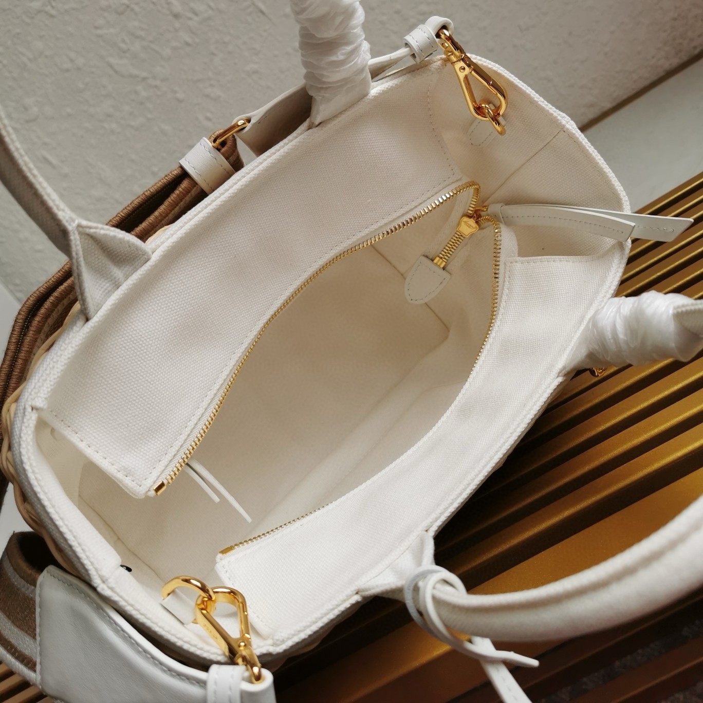 – Linen blend interior with two pockets, one with zipper