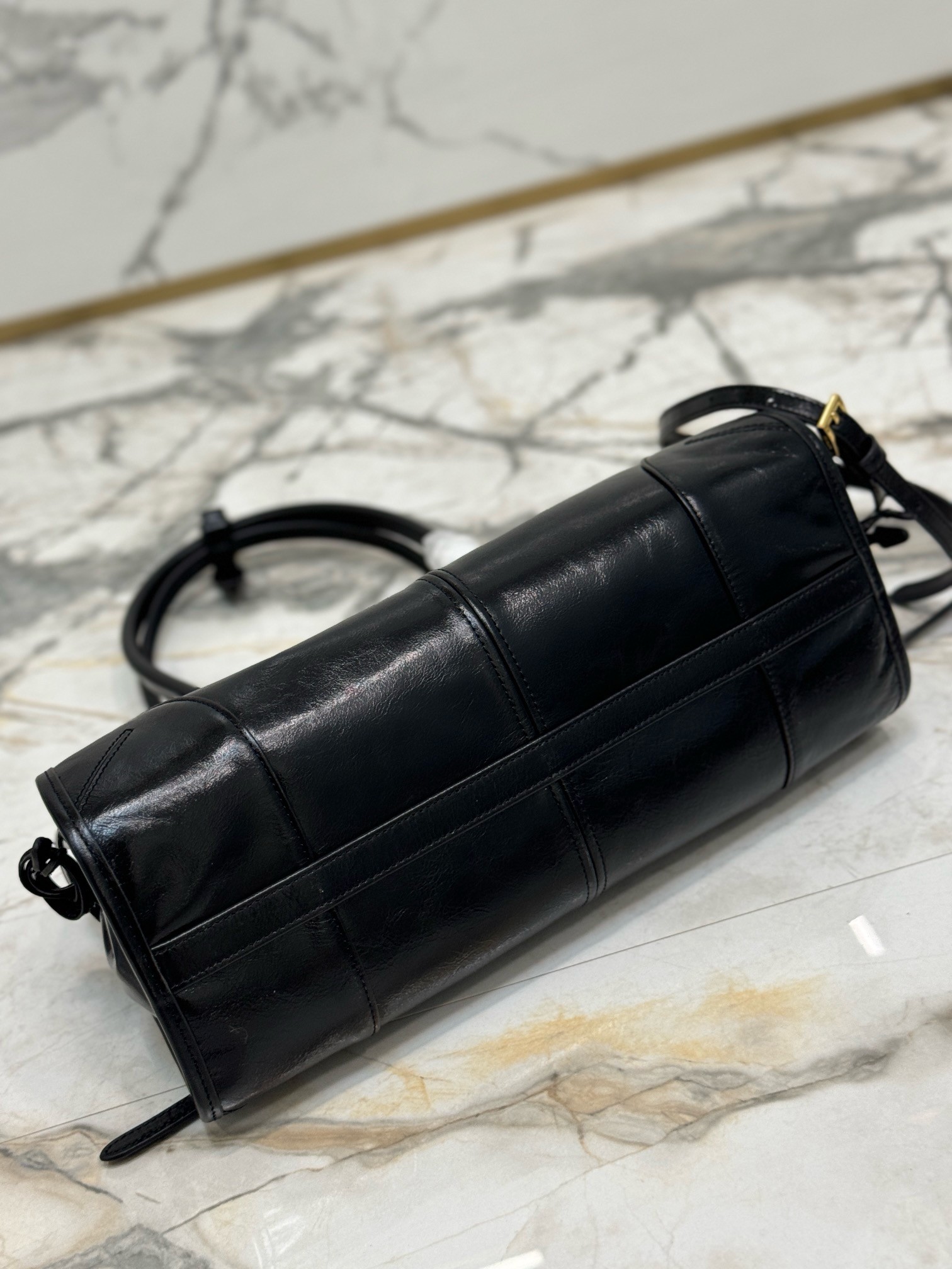 – Nappa and nylon interior with center zipper compartment and zipper patch pocket