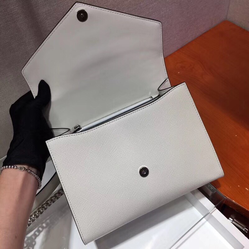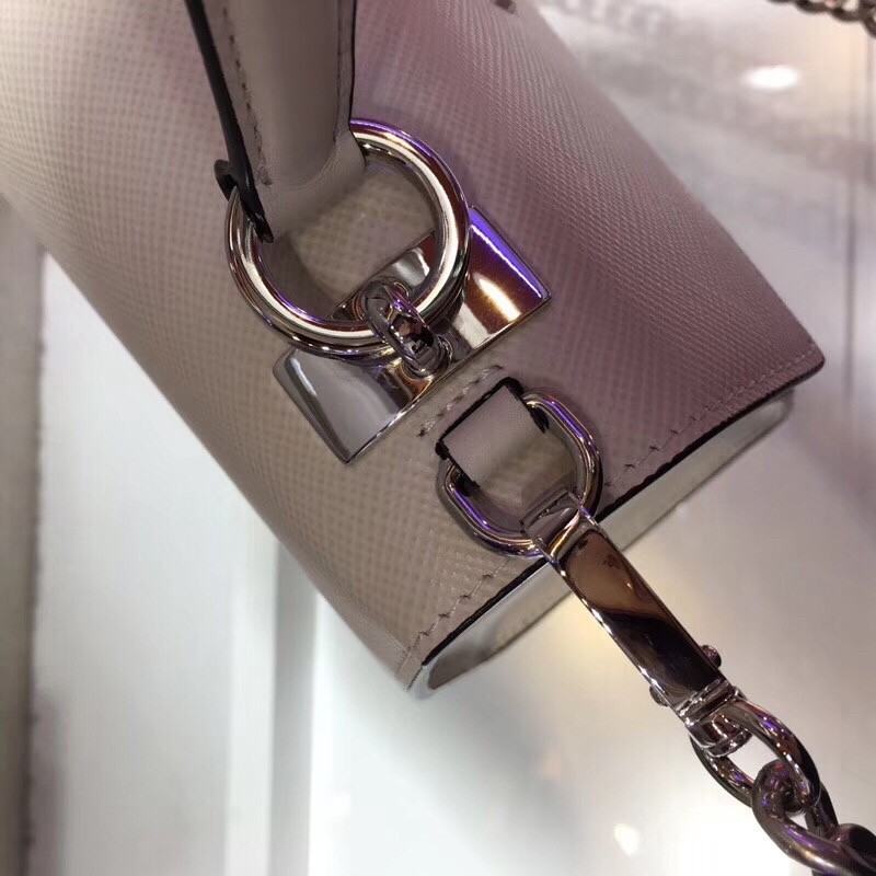 – Detachable metal chain shoulder strap with Saffiano leather shoulder pad