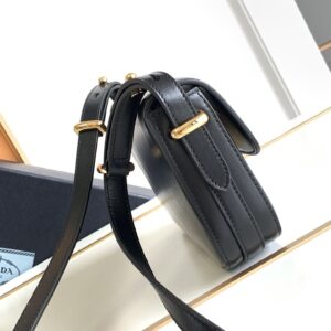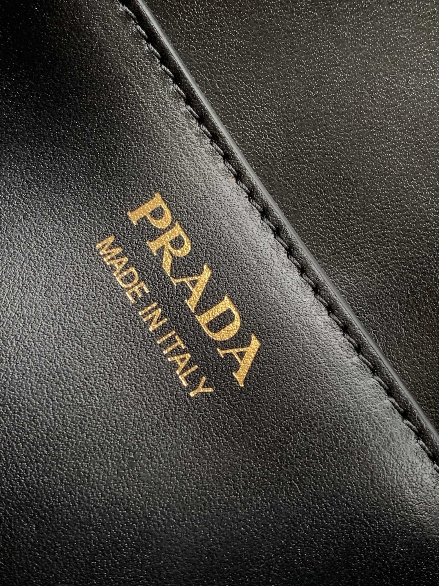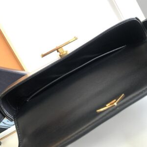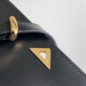 – Logo engraved on the enameled metal triangle clasp on the flap