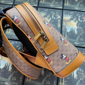 Mickey Mouse’s playful image defines this GG canvas backpack. trimmed with light brown leather details that convey a vintage lookand feel. In celebration of the Lunar New Year. Disney’s legendary character appears throughout Gucci’s ready-to-wear and accessories for the Cruise 2020 collection. displayed as colorful prints. embroidered patches or jacquard motifs.