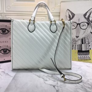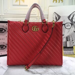 Introducing the Gucci AAA-Marmont medium tote bag. a stylish and practical addition to the GG Marmont line. Crafted from black matelass?? leather. this tote features antique gold-toned hardware and a microfiber lining with a suede-like finish. What sets this bag apart is its use of an alternative chrome-free tanning process. reducing its environmental footprint compared to traditional methods.