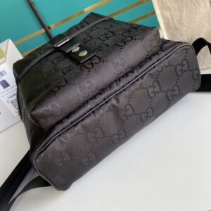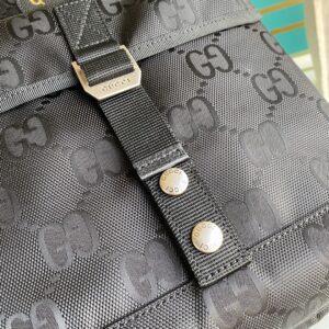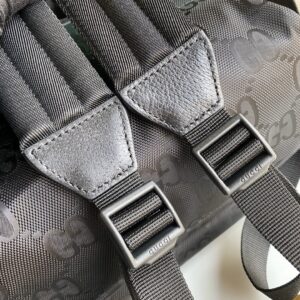 The Gucci AAA-Off The Grid backpack is a sustainable accessory made from recycled materials and trims. The black GG nylon used in the backpack is sourced from ECONYL. a nylon fabric made from regenerated materials such as fish nets. carpets. and other scraps. This helps to decrease the ecological footprint of the backpack. The backpack also features black ribbon trim. leather details. and palladium-toned hardware. The leather insert is made through an alternative metal or chrome-free tanning process. reducing the environmental footprint compared to traditional methods. The metal trims are made from recycled brass alloys with nickel-free finishes. The ribbons and cord in the backpack are made from recycled polyester. which reuses waste or byproducts. reducing the environmental footprint associated with new fossil fuel-based material. The interior of the backpack has two zip pockets. and it has a 10cm handle drop. The backpack weighs 0.84kg and measures W30cm x H36.5cm x D10 cm. The Gucci Off The Grid collection is part of the Gucci Circular Lines concept. which supports the House’s vision for circular production. The collection is designed for those mindful of their environmental impact and uses recycled. organic. bio-based. and sustainably sourced materials.