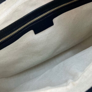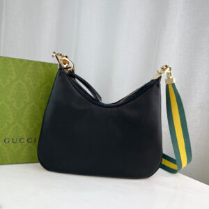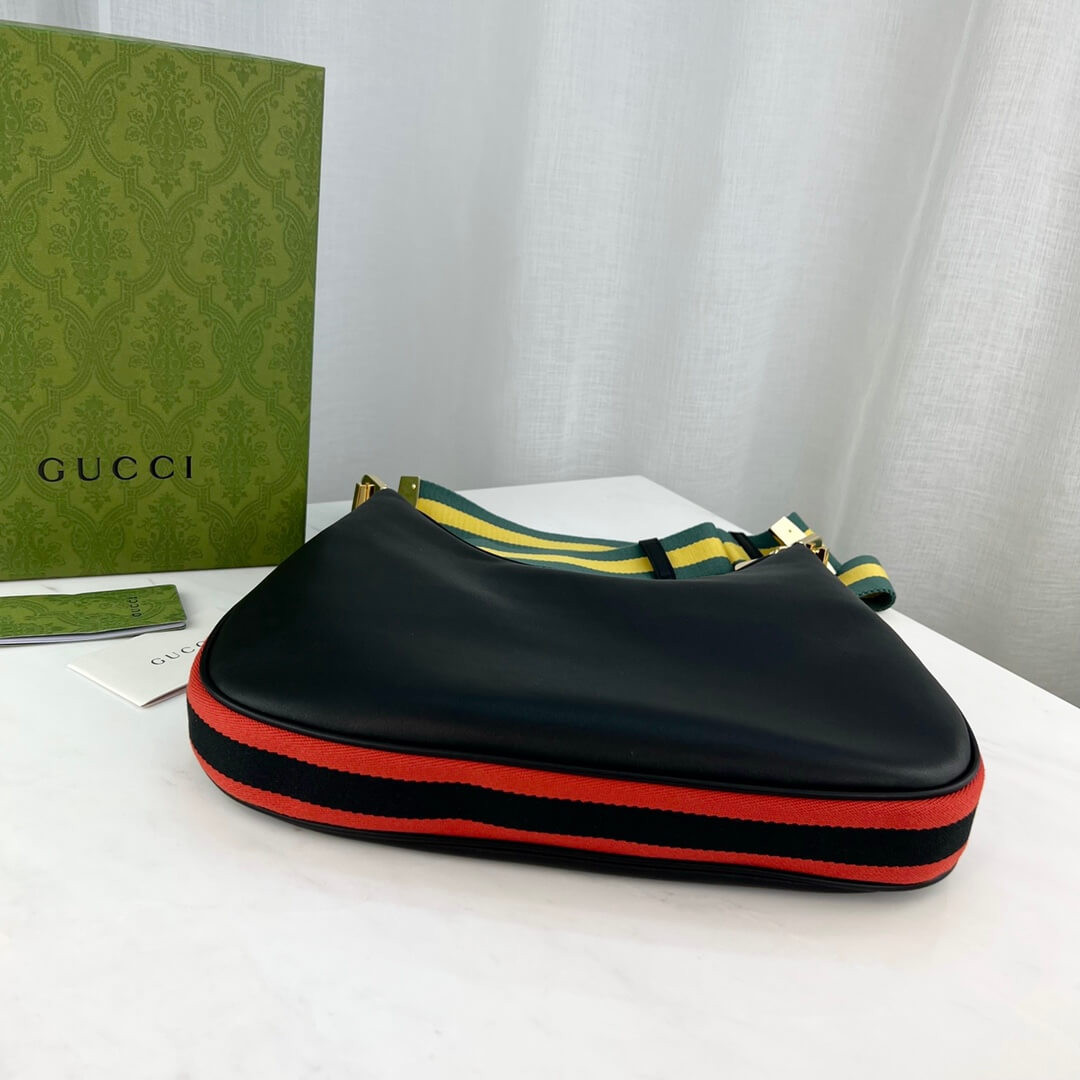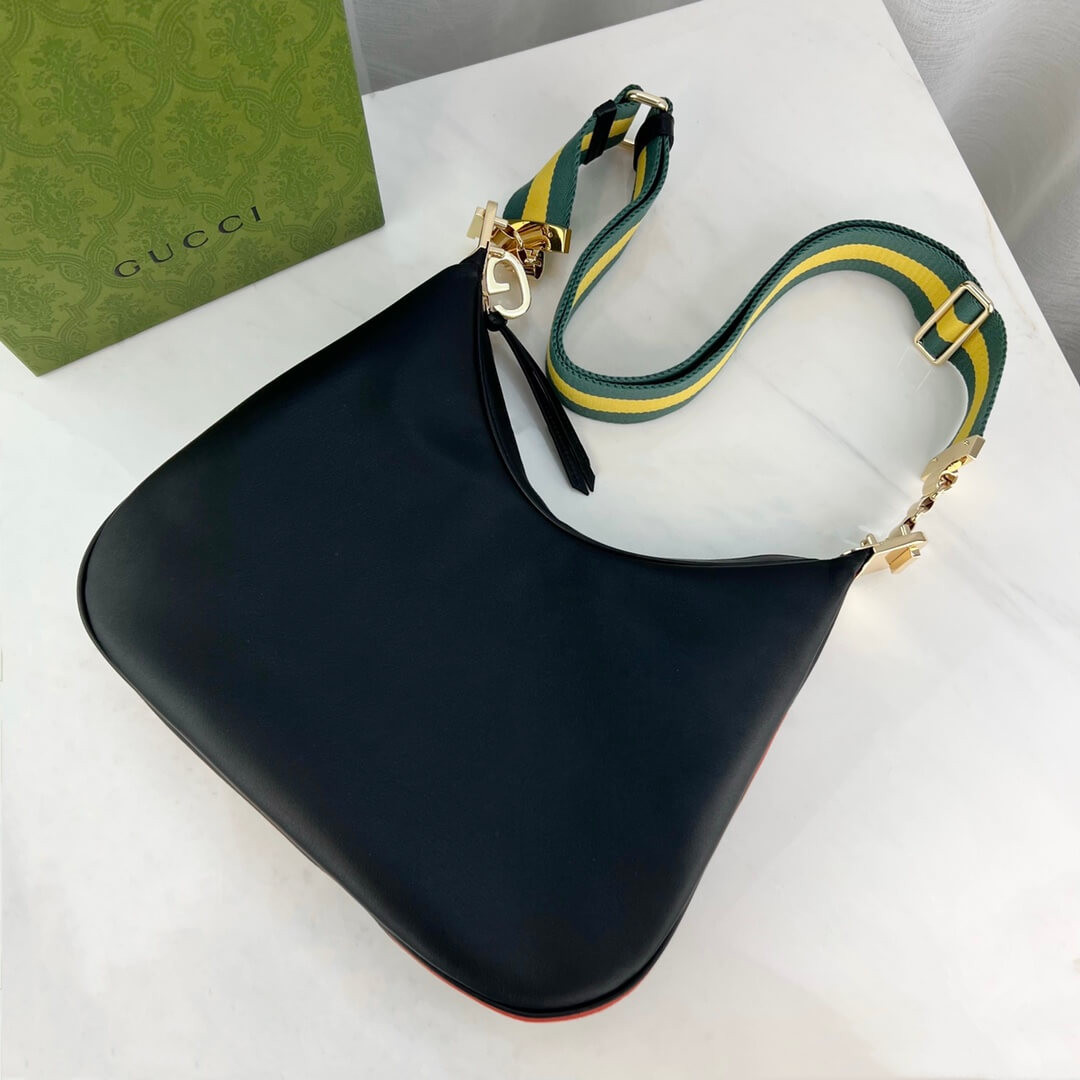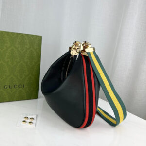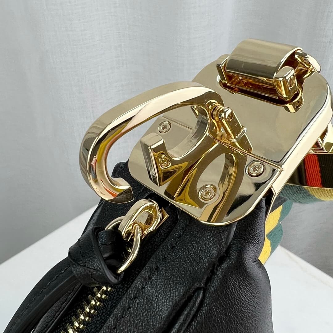 An ode to the timeless Hollywood glamour that shaped Gucci Love Parade, classic elements from the House’s archives are reintroduced. Distinguished by its crescent moon shape, the accessory is further defined by a G shaped hook closure. Paired with soft materials, the heritage hardware creates a refined design with vintage appeal. This medium version is crafted in black leather with orange and black Web trim.