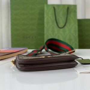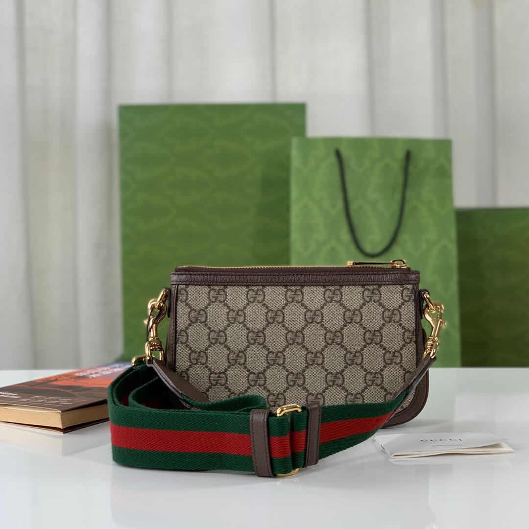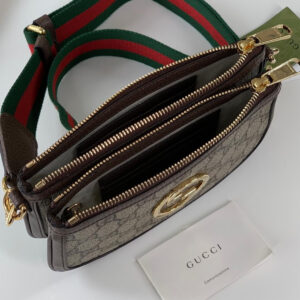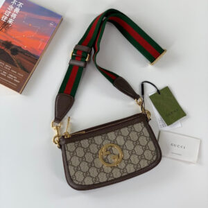 The Round Interlocking G emblem comes straight from the House archives. Emblems representative of Founder Guccio Gucci’s initials, have been reworked in a variety of forms and interpretations. Here it sits atop a beige and ebony GG Supreme canvas base, enriched with a green and red Web strap, resulting in a modern variation of a classic accessory.
