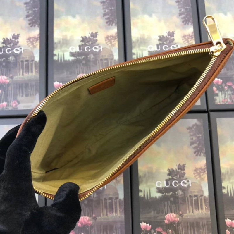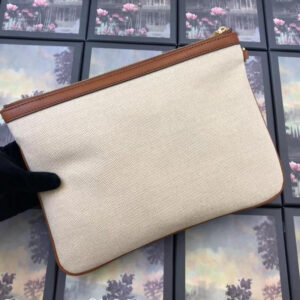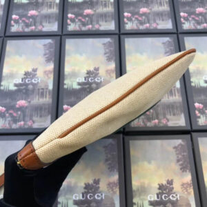 This stylish bag is crafted of beige canvas with a signature green and red canvas web stripe. and a gold interlocking GG logo on the front. The pouch features golden brown leather trim. and an optional. matching wristlet strap with gold hardware. The top zipper opens to a pale green fabric interior.