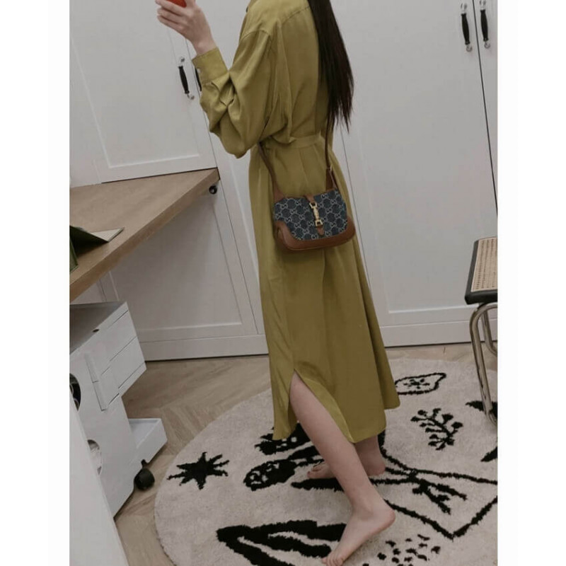 Brought back to the forefront. the recognizable shape is presented in denim with a GG motif and enhanced with an additional. detachable shoulder strap. Attached to the bag with a buckle closure. the second strap adds a contemporary feel to the archival style. providing new ways to wear??from top handle. shoulder to cross body. The Jackie 1961: available exclusively in Gucci stores and on Gucci.com