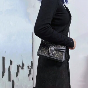 Reminiscent of an archival symbol, the textured tiger head spur is the Dionysus’ defining feature. The feline appearsthroughout the universe, expressing the House’s fascination with the wild beauty of the natural world. Here, the antique silver-toned hardware is paired with a black and ivory GG denim jacquard.