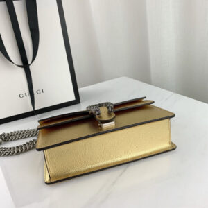 The Dionysus shoulder bag is presented in shiny silver leather. The now defining tiger head closure??a unique detail referencing the Greek god Dionysus. who in myth is said to have crossed the river Tigris on a tiger sent to him by Zeus??is further enhanced with sparkling crystals. The sliding chain strap can be worn multiple ways. changing between a shoulder. crossbody and a top handle bag.