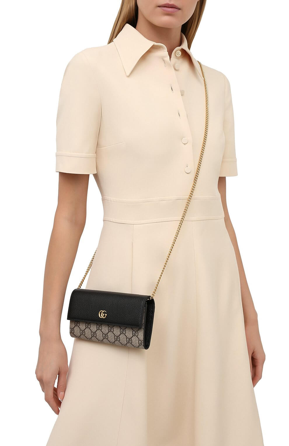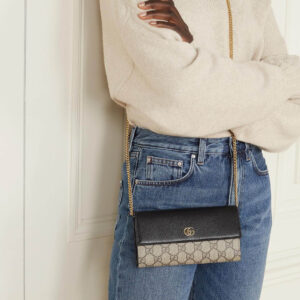 A slim wallet crafted from a mix of the House’s monogram canvas and smooth black leather and completed by a delicate chain strap. A part of the GG Marmont line, the style is defined by a mini version of the emblematic Double G hardware.