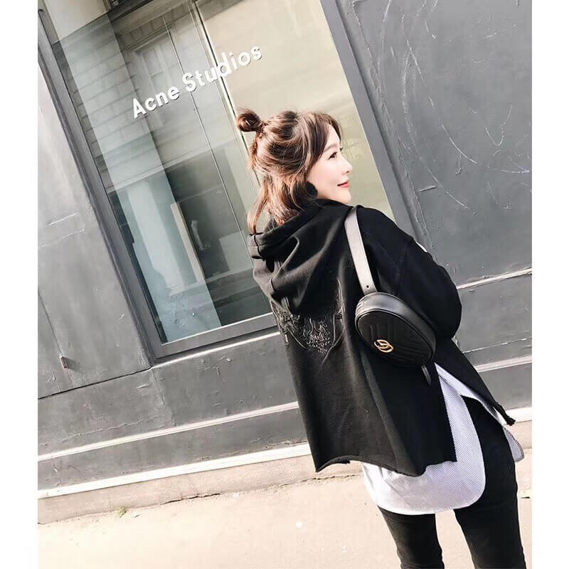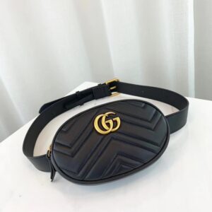 Part of the GG Marmont line. the belt bag was presented for the first time by Alessandro Michele in the Pre-Fall 2017 collection. It has a sportswear-inspired rounded shape with a leather belt which is designed so the bag can be worn high on the waist. It features the recognizable Double G detail-an archival play on the Running G.