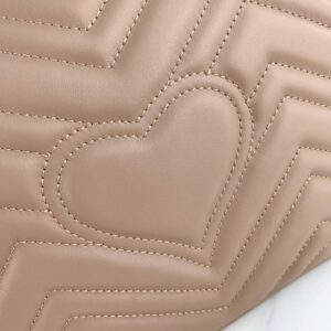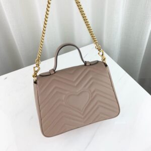 The small GG Marmont top handle bag has a softly structured shape and an oversized flap closure with Double G hardware. Made in matelasse chevron leather with a heart on the back.
