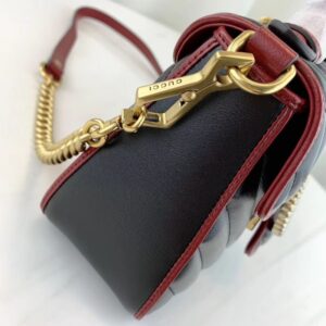 The GG Marmont bag is reimagined for Pre-Fall 2019. made from black diagonal matelasse quilted leather and completed with a twisted torchon Double G embellishment. The mini top handle’s distinct softly structured shape is outlined in contrast cerise piping. highlighting its oversized flap closure. A removable chain strap allows the satchel shape to also be worn as a shoulder bag.