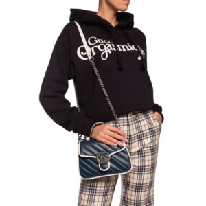 The GG Marmont bag introduced in blue for Cruise 2020. made from diagonal matelasse quilted leather and completed with a twisted torchon Double G embellishment. The mini top handle’s distinct softly structured shape is outlined in contrast white piping. highlighting its oversized flap closure. A removable chain strap allows the satchel shape to also be worn as a shoulder bag.