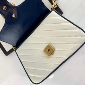 The Gucci GG Marmont Mini Top Handle Bag 583571 White is a stylish and versatile accessory that can be worn as a satchel or shoulder bag. It features a distinct softly structured shape that is outlined in contrast white piping. highlighting its oversized flap closure. The bag is made from white diagonal matelasse leather with a vintage effect and completed with a twisted torchon Double G embellishment. The antique silver-toned hardware adds a touch of elegance to the bag. The interior of the bag features a microfiber lining with a suede-like finish and an open pocket for storing small items. The bag comes with a detachable chain shoulder strap with a 21.9″ drop and a top handle with a 2.4″ drop. The bag measures 8.3 W x 6.1 H x 3.1 D. making it the perfect size for carrying your essentials.