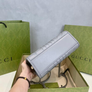 The Gucci GG Marmont Small Tote Bag 681483 is a part of the GG Marmont collection. which is known for its Double G hardware. This hardware is a modern interpretation of a Gucci belt buckle from the 1970s and has become a signature of the brand. The small tote bag is made of soft white matelasse leather and features antique silver-toned hardware. The interior is lined with microfibre and has a suede-like finish. The bag has one open pocket and a strap drop of 28cm. The dimensions of the bag are W26.5cm x H19cm x D11cm.