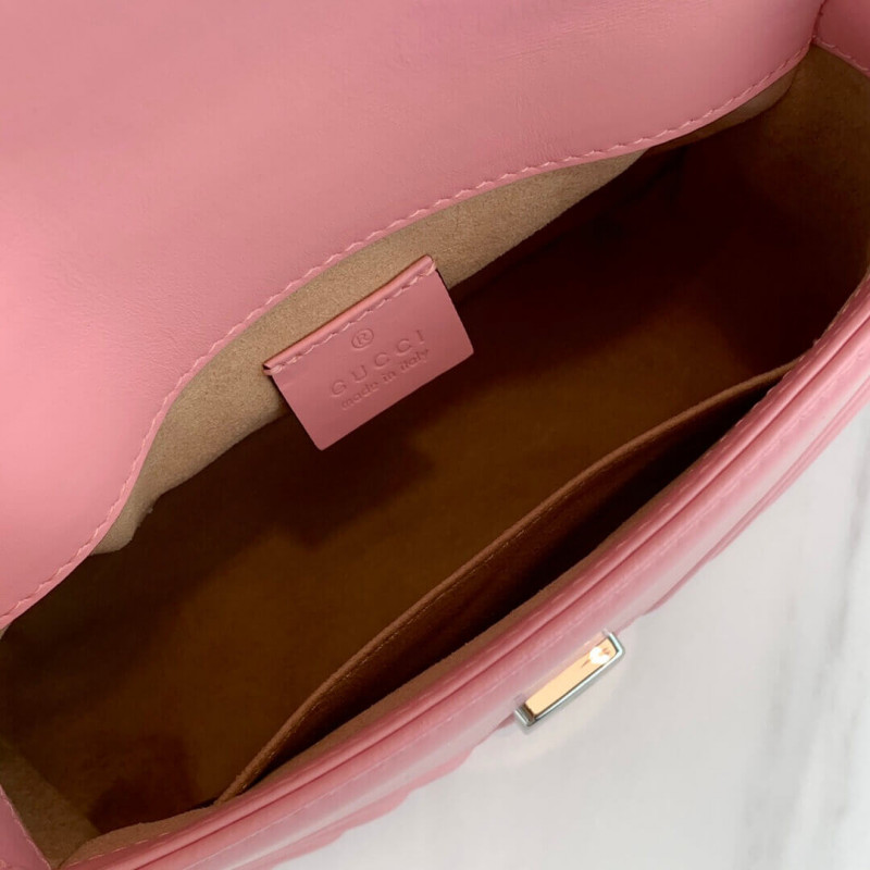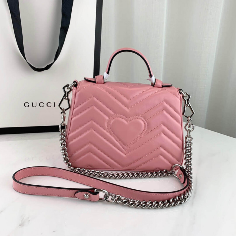 Presented in a light pink shade. the mini GG Marmont top handle bag has a softly structured shape and a flap closure with Double G hardware. The bag is equipped with a leather top handle and chain shoulder strap for added comfort and multifunctional use. Made in matelasse chevron leather with a heart on the back. pastels push the color focus throughout the Pre-Fall 2020 collection. in soft. vibrant hues.