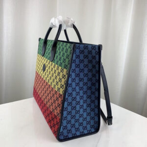 Embracing the new possibilities that lie within variations of the Gucci archives, various pieces throughout the collection provide a new lens through which to view the emblematic GG rhombi motif. Already an evolution of the House logo, it is once again reimagined in a series of bright colours—a theme that has become synonymous with the Creative Director’s vision. This large tote bag is part of the GG Multicolour collection.
