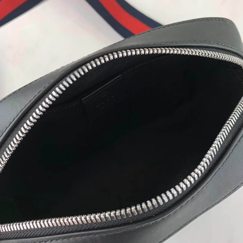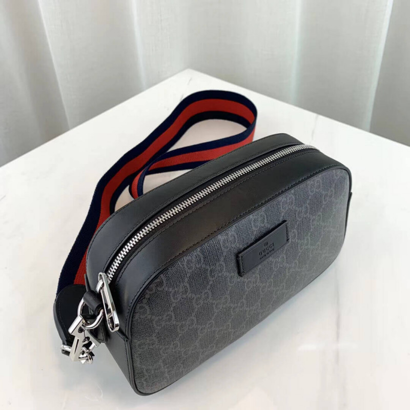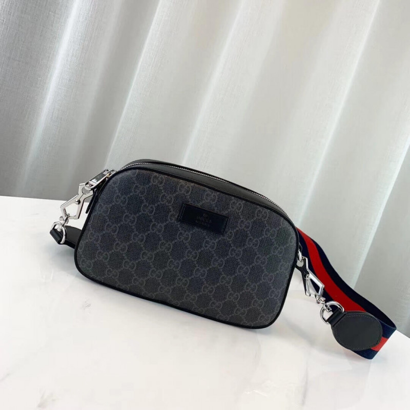 Gucci Messenger bag with black/grey soft GG Supreme with black leather trim. G- ucci trademark front leather tag detail. top zipped fastening. inner flat pocket. blu and red Web detachable shoulder strap.