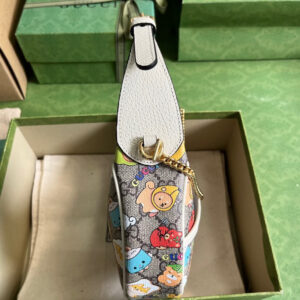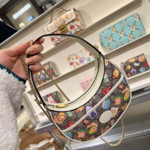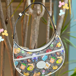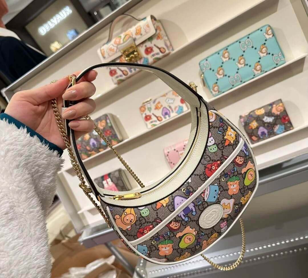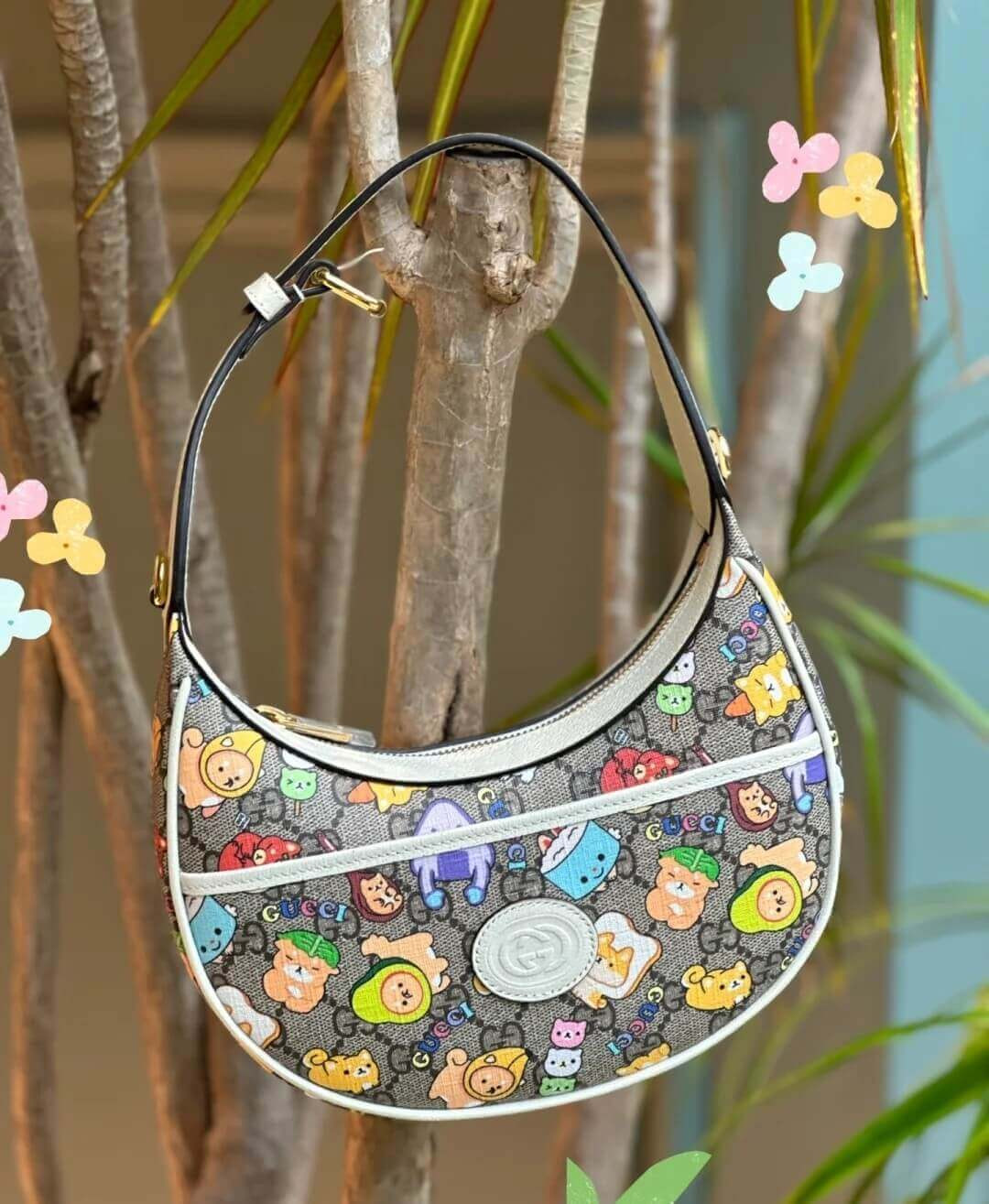 The artwork by America-based illustrator and designer, Angela Nguyen, also known as ‘Pikarar’, adds a playful touch to ready-to-wear pieces and accessories with vibrant prints or embroideries inspired by pop culture, anime, and animals. Here this mini bag is defined by a Gucci animal print.