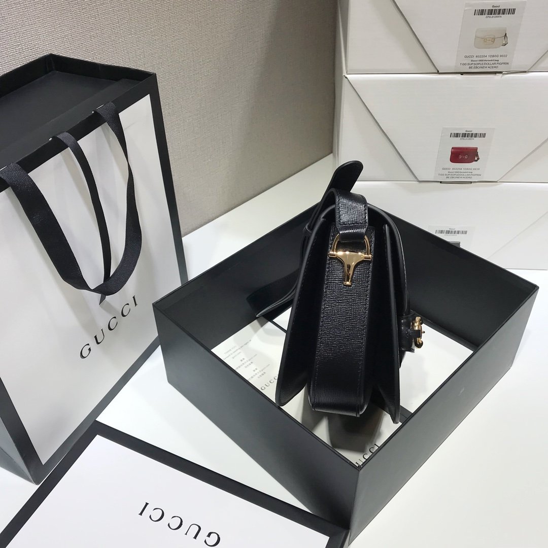 The Gucci Horsebit 1955 shoulder bag is a small flap shoulder bag that was introduced for Cruise 2020. It is recreated from an archival design and features the iconic Horsebit detail at the front. as well as a half Horsebit detail at each side. The bag is made of black textured leather with a vintage effect and is paired with gold-toned hardware. The microfibre lining has a suede-like finish and there are three gussets with one zipper and one open pocket.
