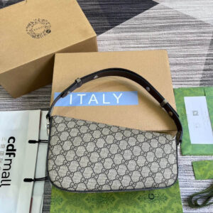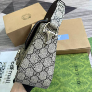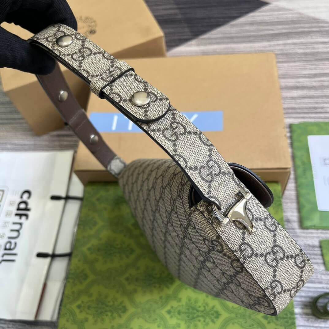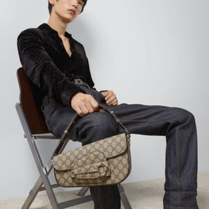 As the historic Horsebit hardware celebrates its 70th anniversary, the House looks at new ways of combining archival features with contemporary silhouettes. Introduced as part of the latest Cruise 2024 collection, this Supreme canvas Gucci Horsebit 1955 handbag is defined by an asymmetrical shape that lends a modern feel to the renowned line.