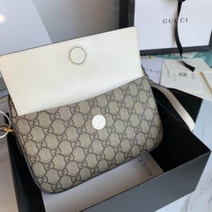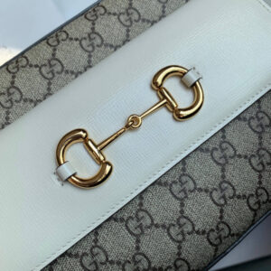 The Horsebit has become synonymous with the brand. Tracing back to Gucci’s equestrian roots. the double ring and bar design is a piece of the House’s heritage. Inspired by archival designs. the Gucci Horsebit 1955 unifies original details first introduced over six decades ago with a modern spirit. For Epilogue. the line is enriched with a small shoulder bag in GG Supreme canvas with contrasting white leather details and a special mechanism that adjusts the length of the shoulder strap so it can be carried on one shoulder or cross body.