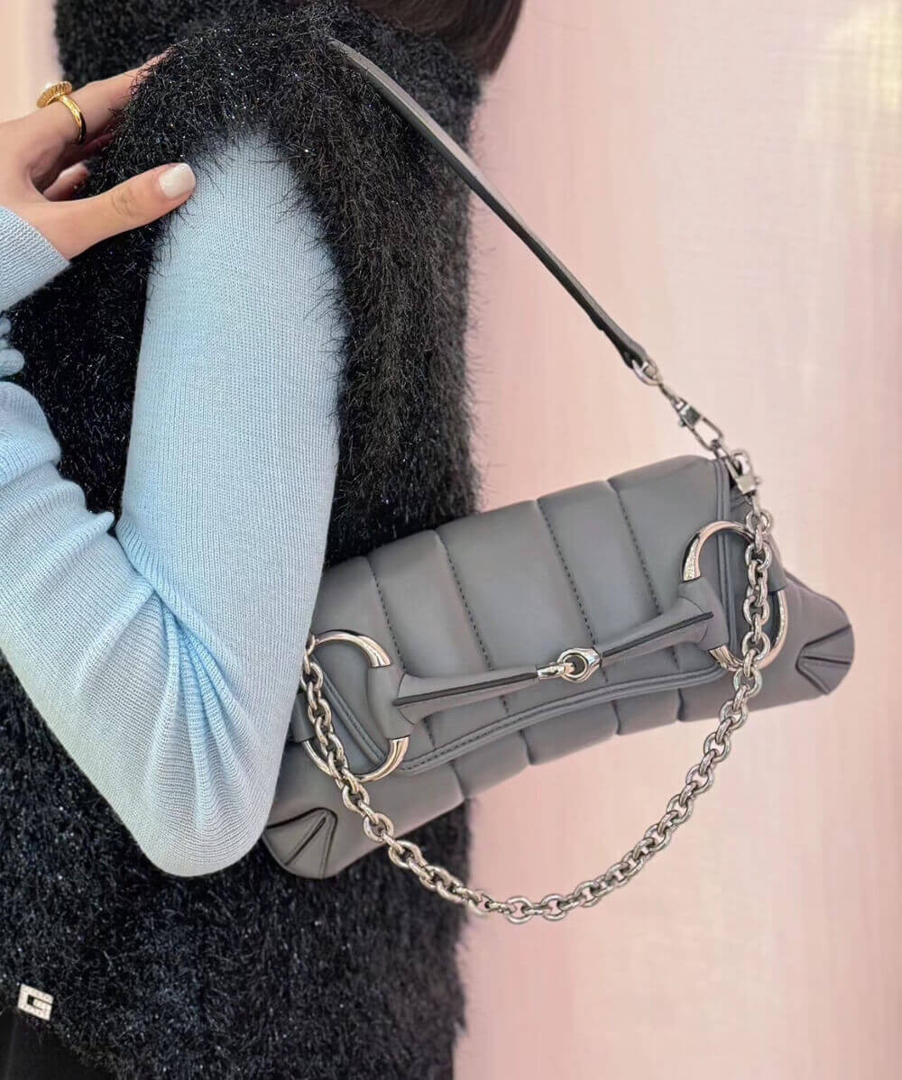 Gucci successfully recalls its past by connecting the archives to the present day. Adorned with a maxi Horsebit, first made popular during the early ‘2000s, this silhouette continues to be one of the most recognisable handbags of the House. Revisited for the Fall Winter 2023 collection, it is presented in various colours and textures that follow a contemporary approach.