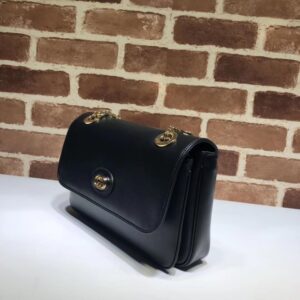 Defined by the Marina chain strap. this beige and black leather shoulder bag is specially treated for a textured. vintage effect. The compact shape is finished with a gold-toned Interlocking G set on a silver-toned plaque??a detail that defines the line. The sliding strap lends a multifunctional element to the style. worn as a shoulder strap or doubled to create a top handle.