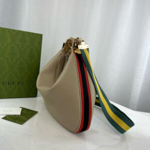 An ode to the timeless Hollywood glamour that shaped Gucci Love Parade, classic elements from the House’s archives are reintroduced. Distinguished by its crescent moon shape, the accessory is further defined by a G shaped hook closure. Paired with soft materials, the heritage hardware creates a refined design with vintage appeal. This medium version is crafted in black leather with orange and black Web trim.