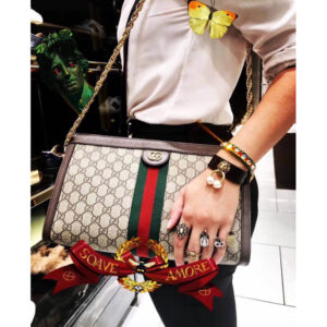 Crafted in GG Supreme canvas with inlaid Web stripe detail. the chain strap shoulder bag boasts a vintage inspired design. The structured shape secures with a magnetic closure. trimmed with leather and Double G hardware??an archival detail.