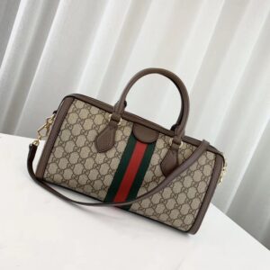 The world of Ophidia evolves with the introduction of a boston bag crafted in GG Supreme canvas with inlaid green and red Web stripe. The accessory is enhanced by a petite play on the Double G. an archival Gucci code from the ’70s that appears atop a leather tab detail and on the zipper pull. The bag is completed with a detachable shoulder strap which allows it to be carried in multiple ways.