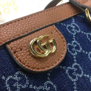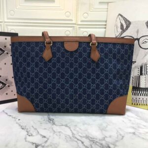 The Gucci Ophidia GG medium tote 631685 is a part of the Ouverture collection and is made in Italy. It features a dark blue and ivory eco washed organic GG jacquard denim with brown leather trim and gold-toned hardware. The cotton linen lining adds to the durability of the bag. The Double G. an archival symbol from the ’70s. completes the vintage inspired style. The tote has a medium size of 15??W x 11??H x 5.5??D and weighs approximately .71kg. It has a magnetic snap closure and double leather handles with a 10?? drop and 21?? length. The interior zipper pocket adds to the functionality of the bag.