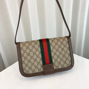 A classic combination of the House’s most recognizable elements??the GG motif and Web stripe??the world of Ophidia continues to evolve. incorporating new shapes and silhouettes. A versatile shape originally inspired by mail carriers. postmen. and bicycle couriers. the messenger bag became a popular item in ’80s urban streetwear. Here. the crossbody bag is crafted in GG Supreme canvas trimmed with textured leather and topped with Double G hardware.