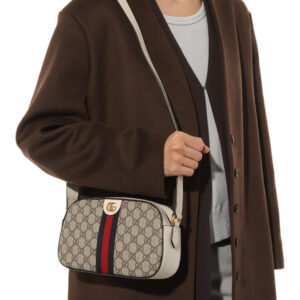 Mirroring the material’s historic origins, GG Supreme is introduced in a timeless mix of blue and beige for Gucci Love Parade. The canvas has come to the front of each collection decade after decade to become a hallmark of the House. Here, the classic palette defines this Ophidia camera bag.